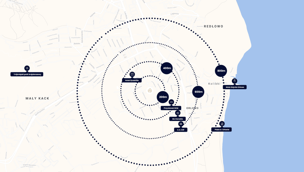 Mimo kameralnego położenia, projekt jest znakomicie skomunikowany z całym miastem. W bezpośrednim sąsiedztwie znajduje się centrum handlowe, markety i siłownie, liczne liczne restauracje i 5 * Hotel Butikowy Quadrille.W niedalekiej odległości znajduje się plaża i molo w orłowie a także przystanek SKM Gdynia Orłowo położony kilkadziesiąt m od budynku